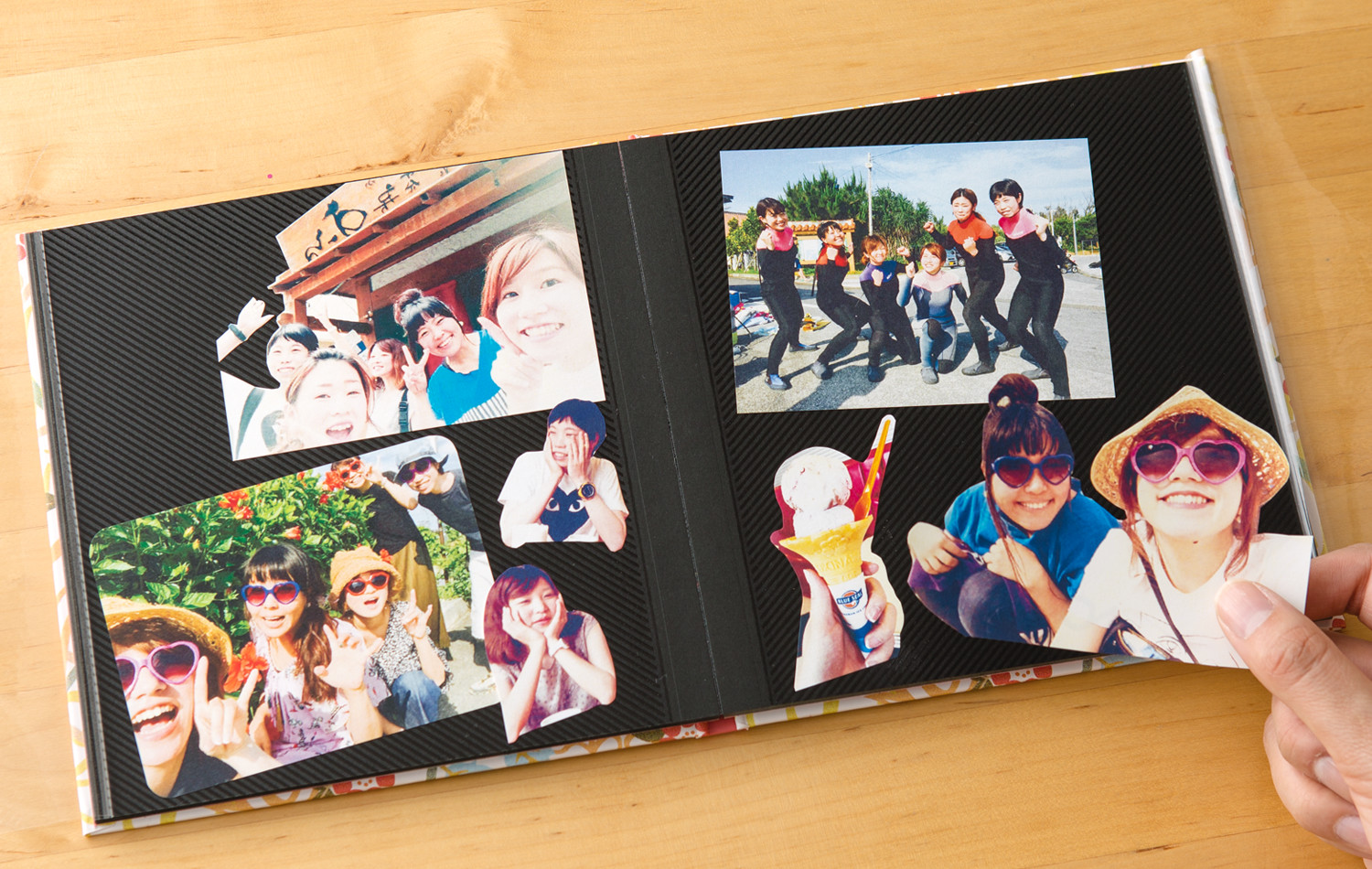 アルバムに写真を貼っていきます。L版写真のまま貼るだけでもいいし、角を丸くしたり、人の形に切ったりしてもメリハリが出て◎